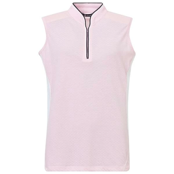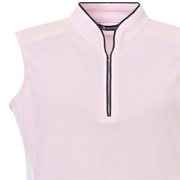 Erin loosefit sleveless in light pink is made of a new soft quality in jaquard knitted jersey in main body. Sidepanels and back is in cotton touch jersey. It is stretchable, nbut also in a loosefit and has DryCool. Low turtle neck collar with knitted pipings with contrast stripes in black. Half zip at front. Abacus logo below collar at back.